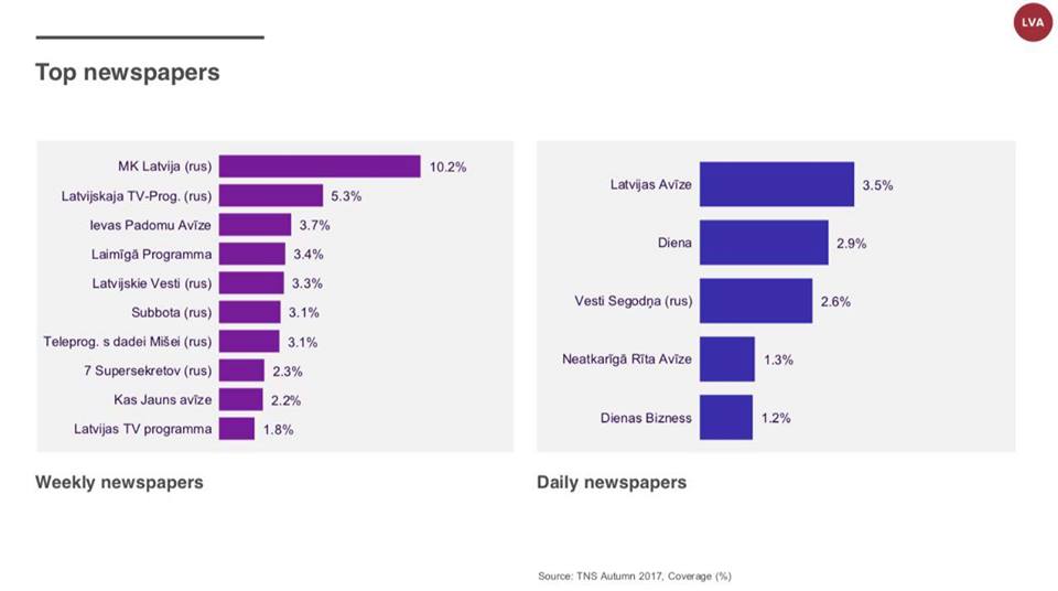 — Но согласно аудитории и законодательства. Сейчас будет меньше, так как законы меняются. Я бы хотела еще показать рейтинги прессы, там вообще на русском языке очень большое количество СМИ. Я так понимаю, "МК Латвия" — это "Московский комсомолец" на русском языке? И ваша газета "Вести" - это аналог нашей русскоязычной газеты "Вести"?